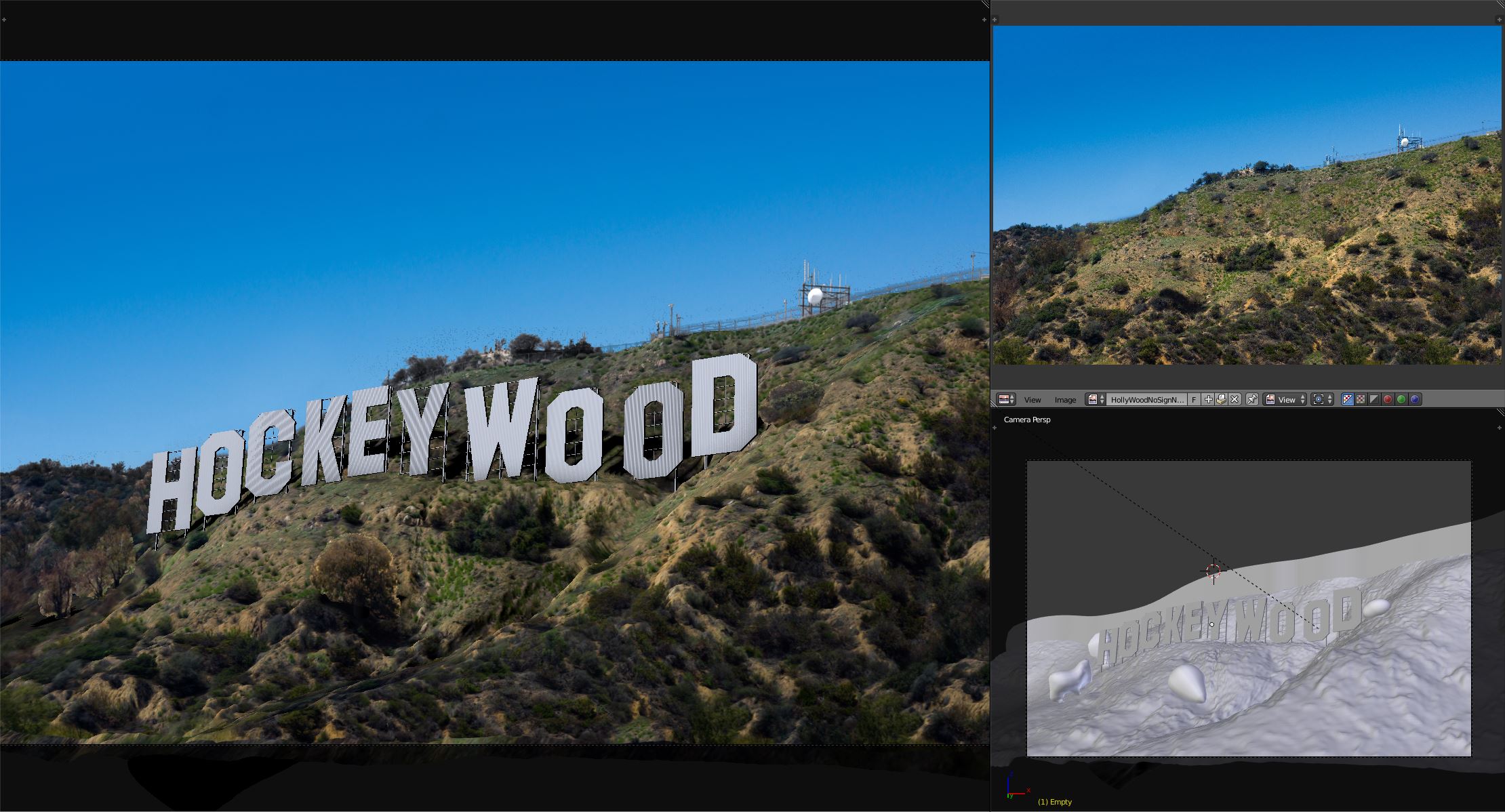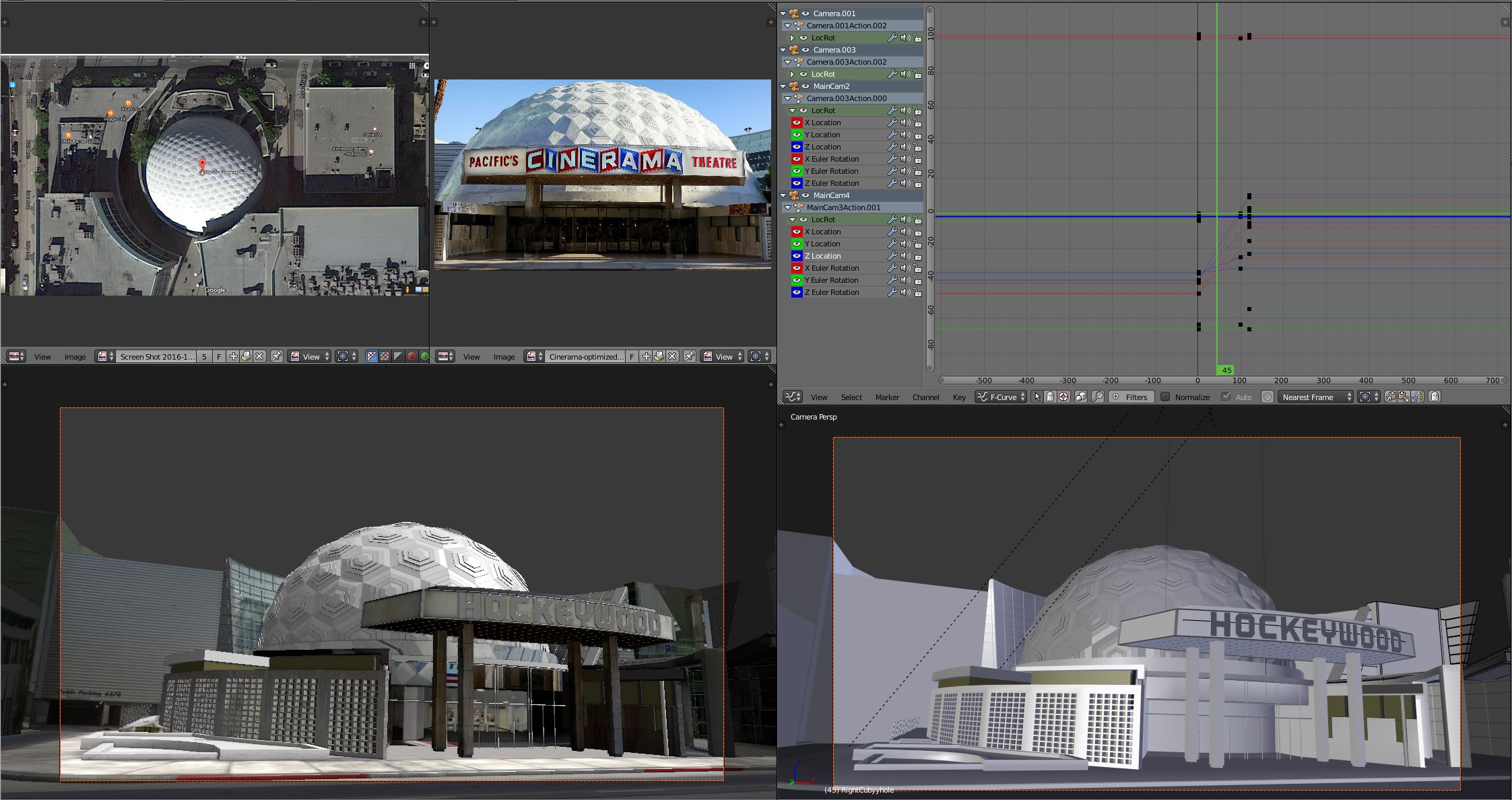 This was a great example of Blender’s versatility. For the two shots below, I had to hand model the scenes to match the Cinerama Dome and the Hollywood Sign. Blender allowed me to quickly draft out my ideas from animation to the final lighting before I exported it to Maya and rendered in V-ray.