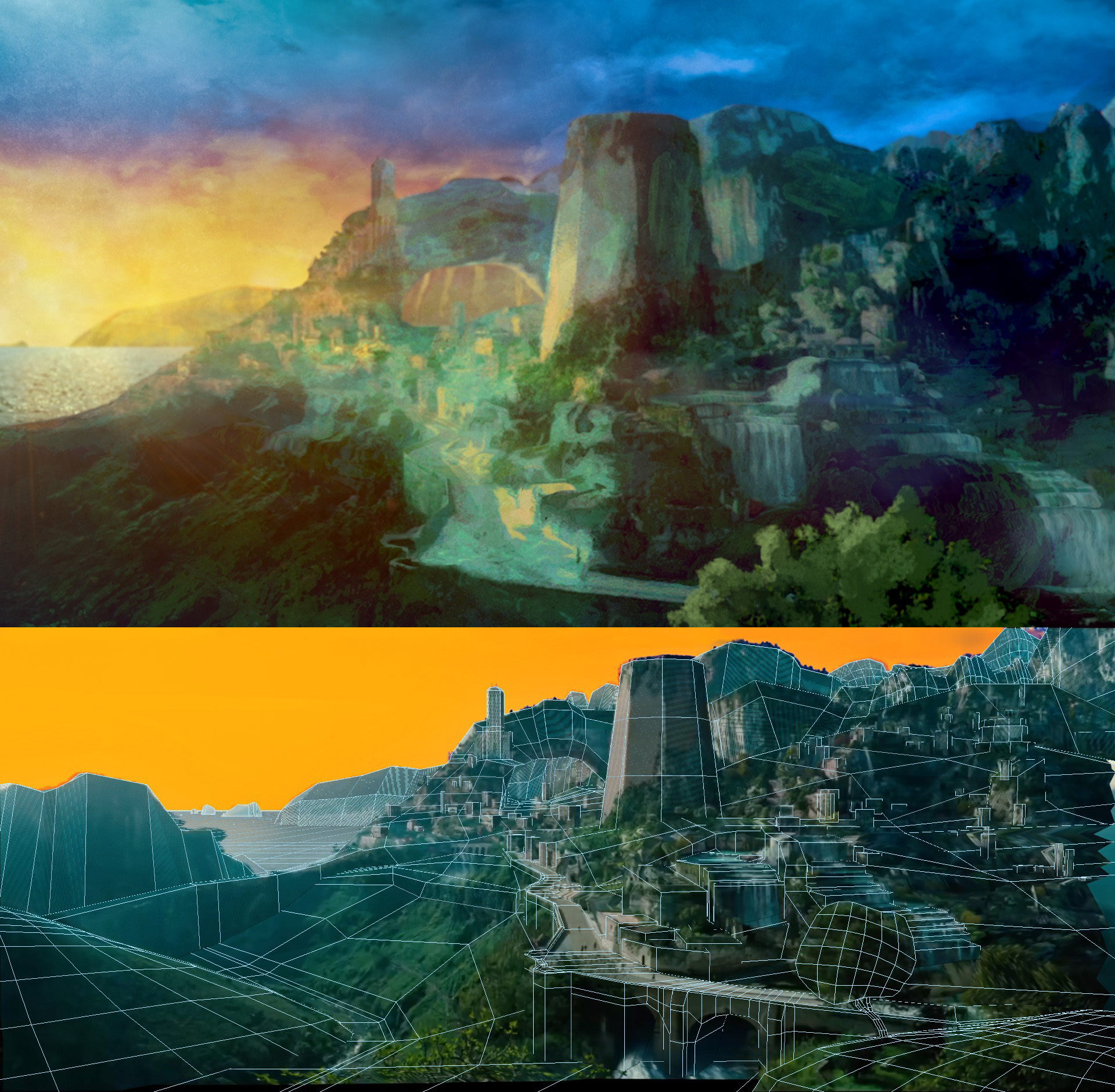 Patty Jenkins (Wonder Woman’s director) thought that many scenes in our sequence were too warlike and wanted some uplifting moments, so I 3D projected this view of Themyscira (home to Wonder Woman and the Amazons) based on a painted version created by my boss, Jason Doherty.