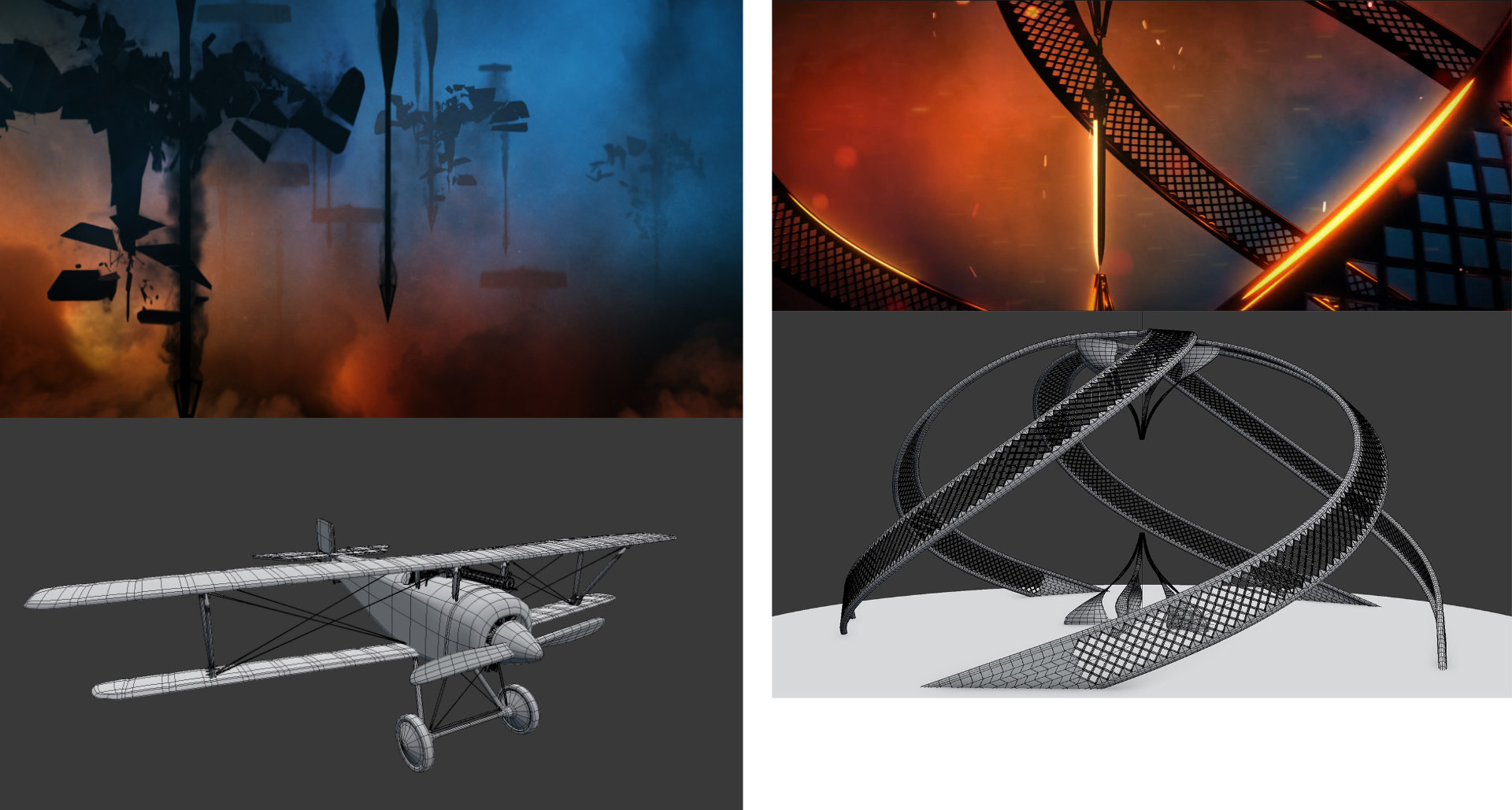Here are several of my more notable models that were used in various scenes. The woman was based on actress Gal Gadot – sculpted in Zbrush and refined in Blender. For the plane, I took inspiration from the WWII German Biplane. My favorite thing to work on was the Sword structure, in which I used arrays and curve modifiers to create a rotating structure effect.