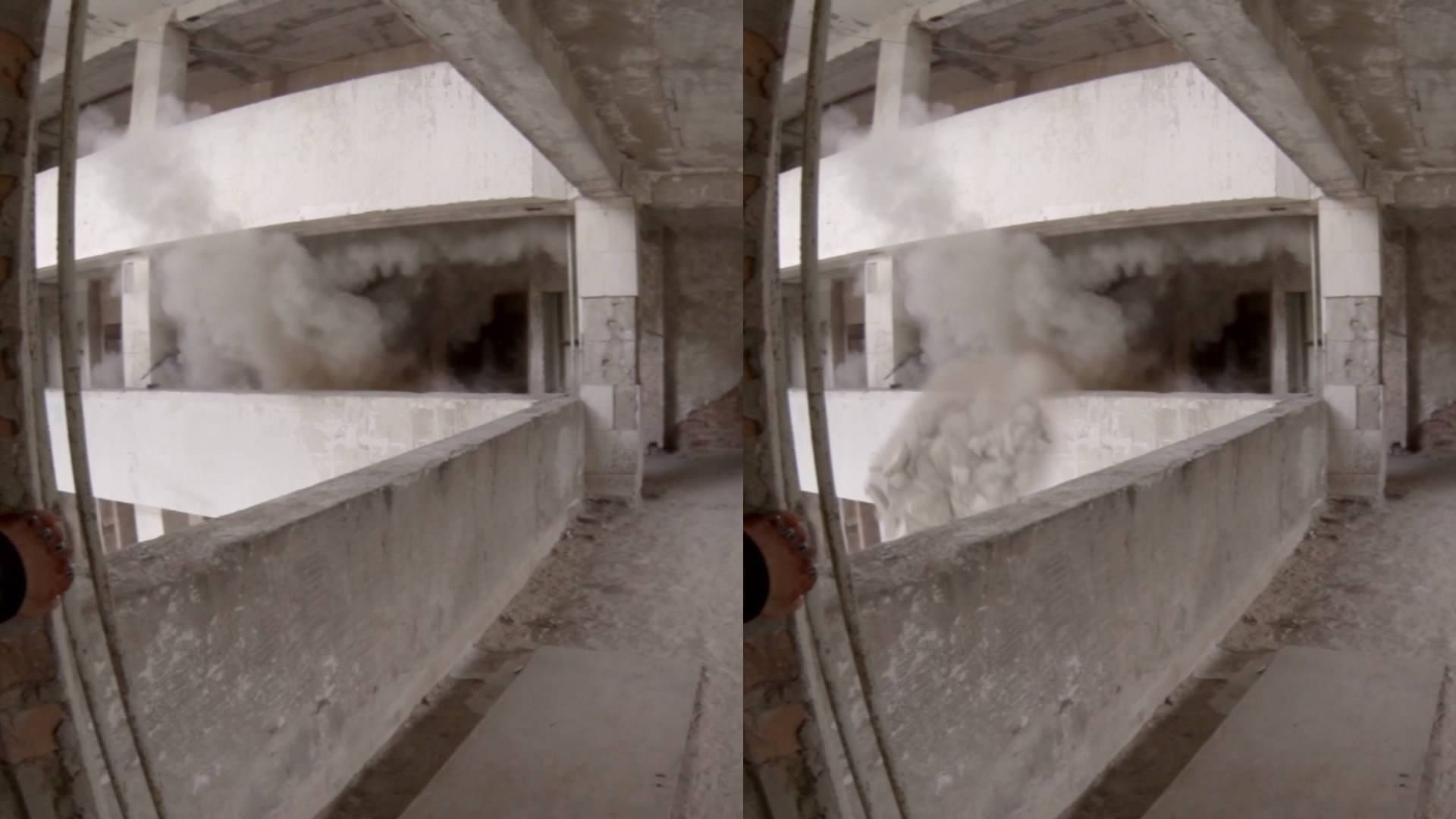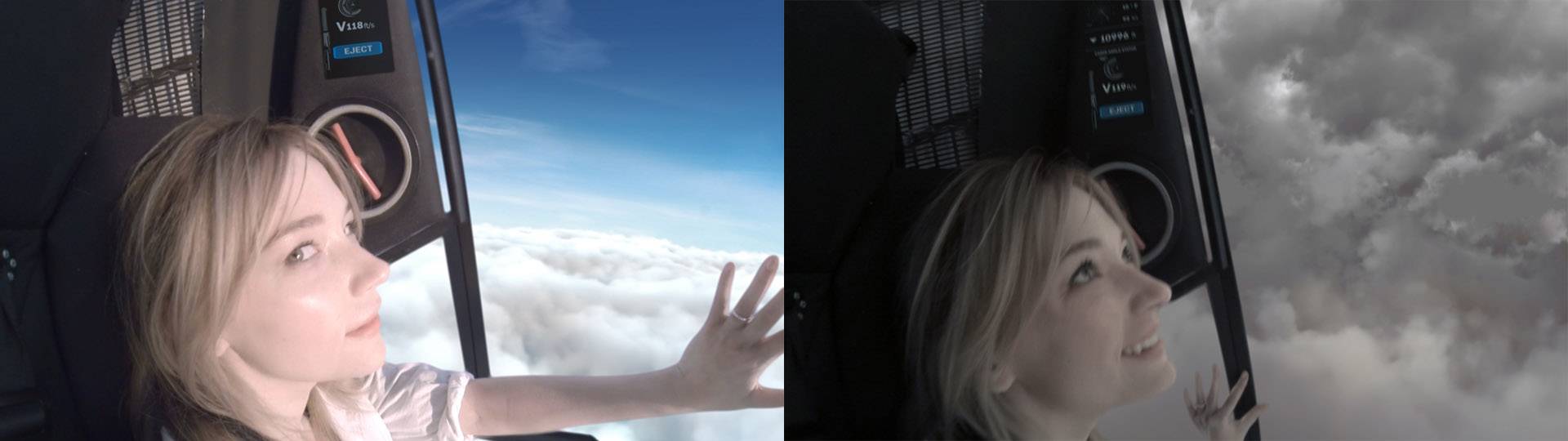 The fall has been filmed in three different parts: sky (above clouds), clouds (inside) and above city. The first part is set with blue sky above and white clouds canvas below – such scenes are always pretty. Then the pod enters the clouds. The GoPro shooting of falling through the clouds looks quite boring – grey screen is the only thing you see. That’s why I added turbulence effect on entering the cloud mass and made huge cave-like hollows inside. Finally, the pod flies out of clouds and we can see quickly approaching city. Hero opens the parachute which softens the impact of collision with track.